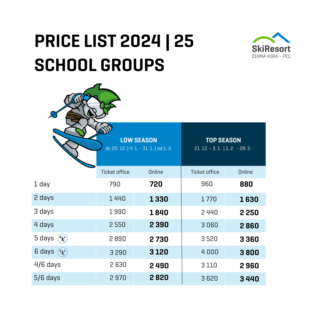 In Tschechien bezuschussen einige Krankenkassen Skikurse für Schulgruppen. Bitte erkundigen Sie sich bei Ihrer Krankenkasse, ob sie ebenfalls einen Zuschuss gewährt. Wir sind bereit, Ihnen die erforderlichen Formulare zu bestätigen. Sie können uns unter obchod@skiresort.cz kontaktieren.