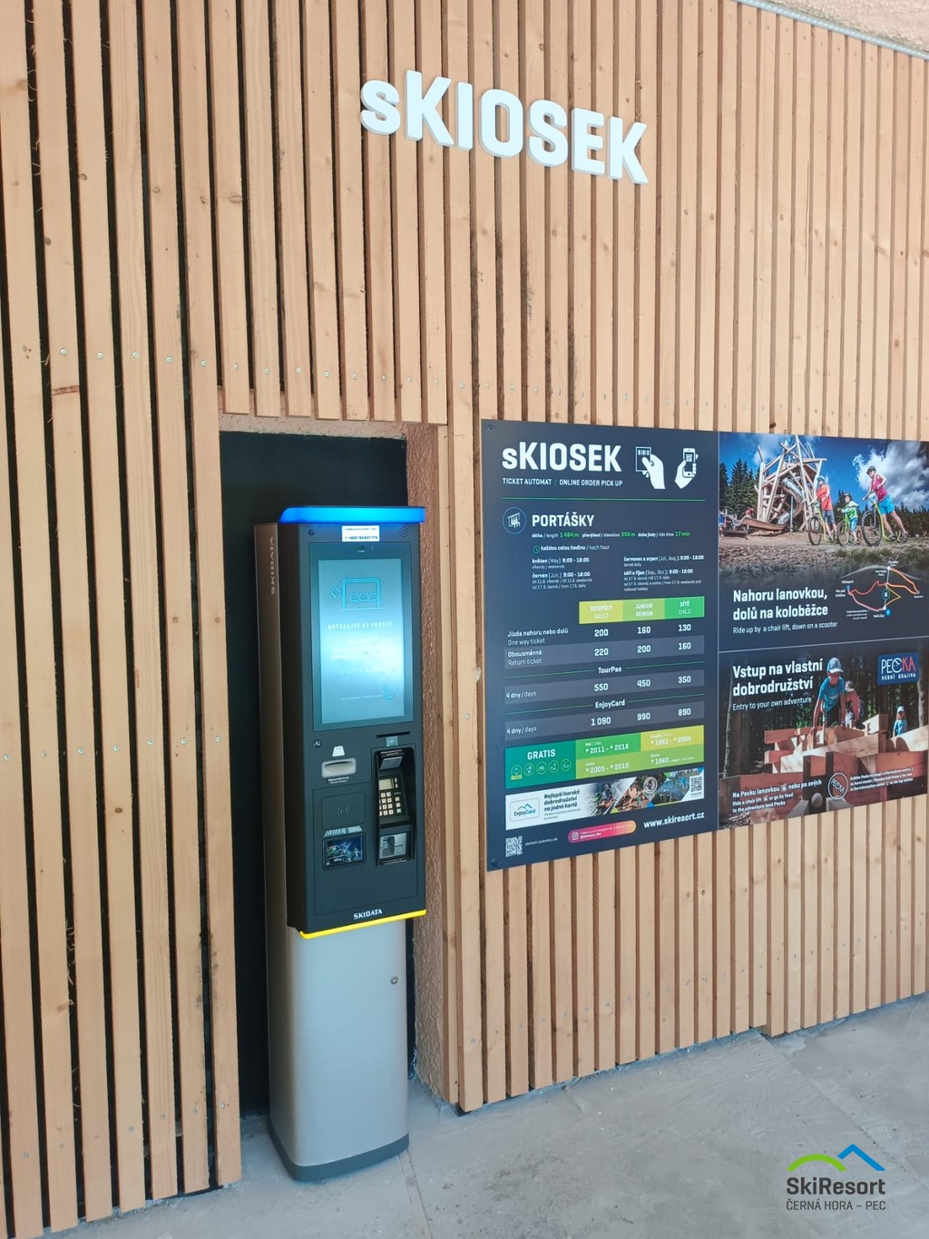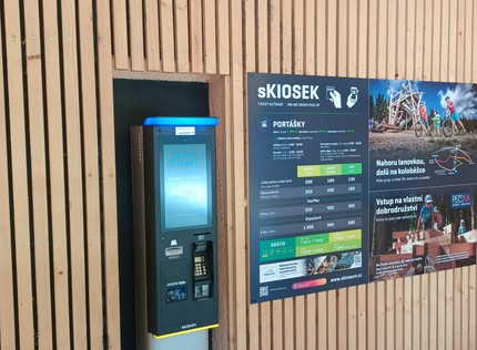 sKiosky function as vending machines and self-service cash registers in one. In winter, you can pick up a ski pass bought online here, or you can buy a ski pass directly here. The sKiosks are open 24/7. You can only pay by credit card at the sKiosek.