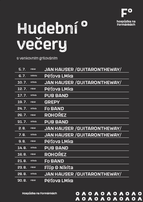 Během 18 letních večerů se můžete těšit na legendární Grepy, Péťovu LMku, kytaristu Jana Hausera, Fo Band i duo Filip & Nikita. Zazní především světové i české covery, vždy v osobitém podání jednotlivých interpretů.