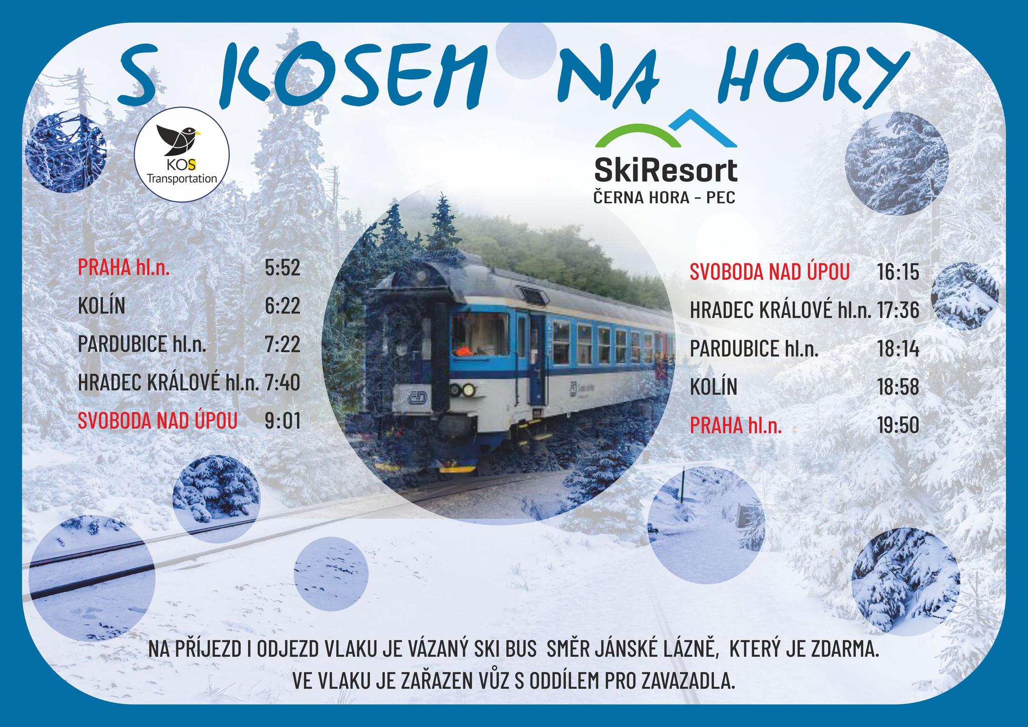 Soukromý dopravce KOS Transportation s.r.o. bude během zimní sezóny vypravovat každou druhou sobotu vlak do Svobody nad Úpou, odkud můžete přestoupit na bezplatné skibusy směřující do Pece pod Sněžkou, nebo do Janských Lázní. V případě zpoždění vlaků skibusy na příjezd vlaku nečekají.