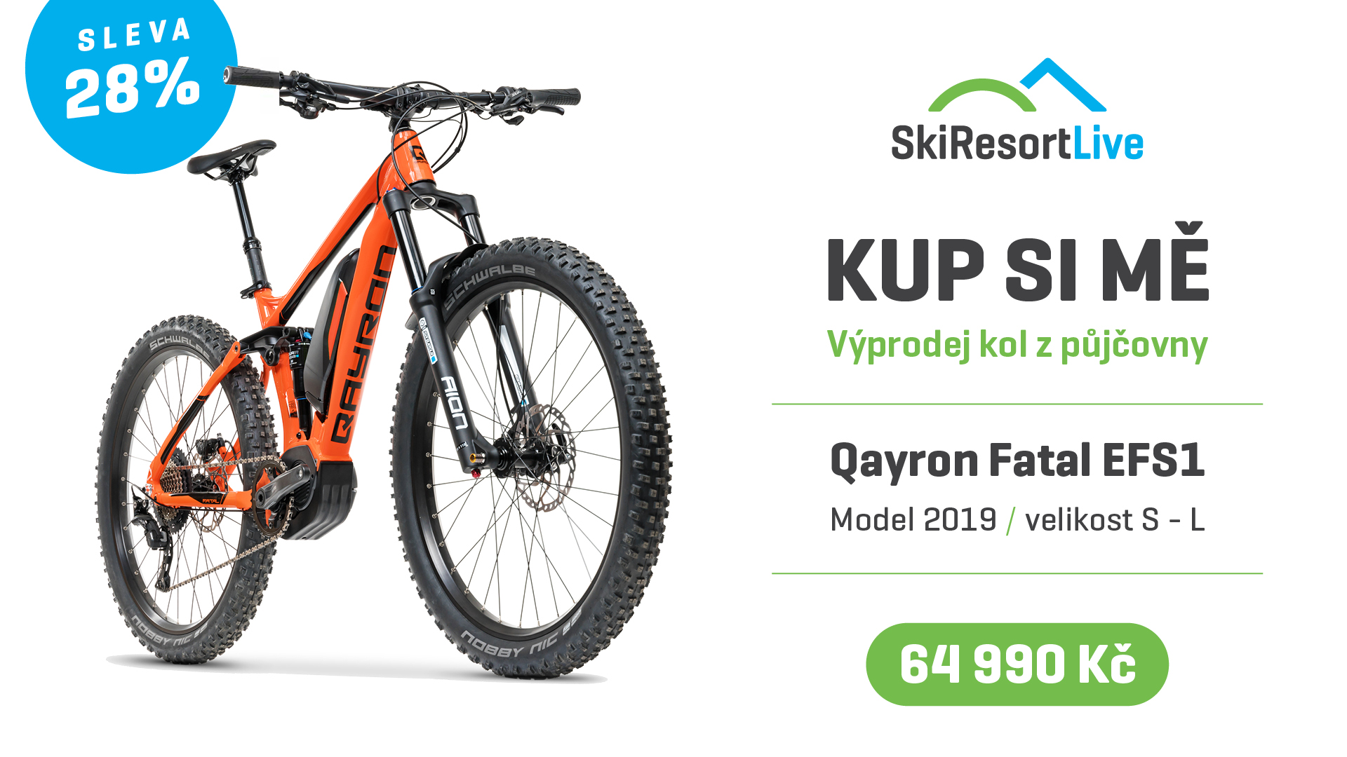Léto je v plném proudu, ale my už teď myslíme na to, jak na podzim udělat v půjčovně SkiResort Live místo pro lyže. Spouštíme proto výprodej horských elektrokol Qayron Fatal EFS 1 a Qayron Fatal EHT1 ve velikostech M a L, se kterými jste toto léto mohli vyrazit do krkonošských kopců.
