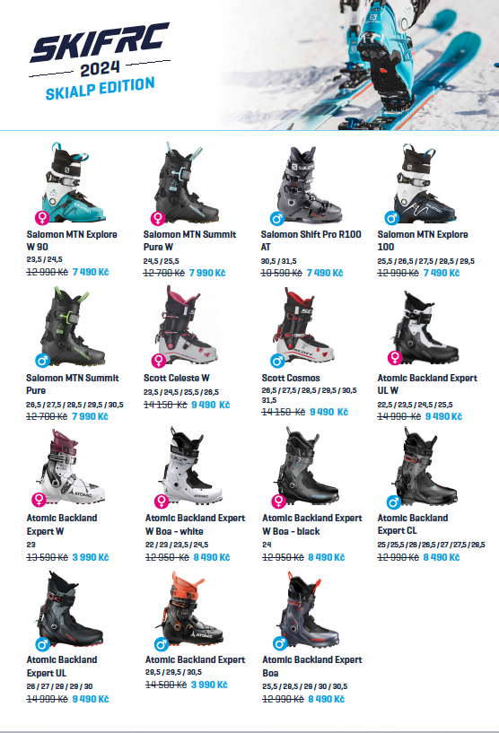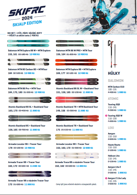 Vybírejte také v nabídce skialpového vybavení, kde najdete značky Atomic, Salomon, Armada, Scott a Leki. Zvýhodněné ceny za SKI SET (lyže, pásy, vázání, boty, hůlky).