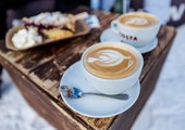 Na pięknym tarasie z leżakami można delektować się na przykład Aperolem Spritz, Bombardino, beczkowym piwem Trautenberk z lokalnego browaru, kawą lub herbatą.